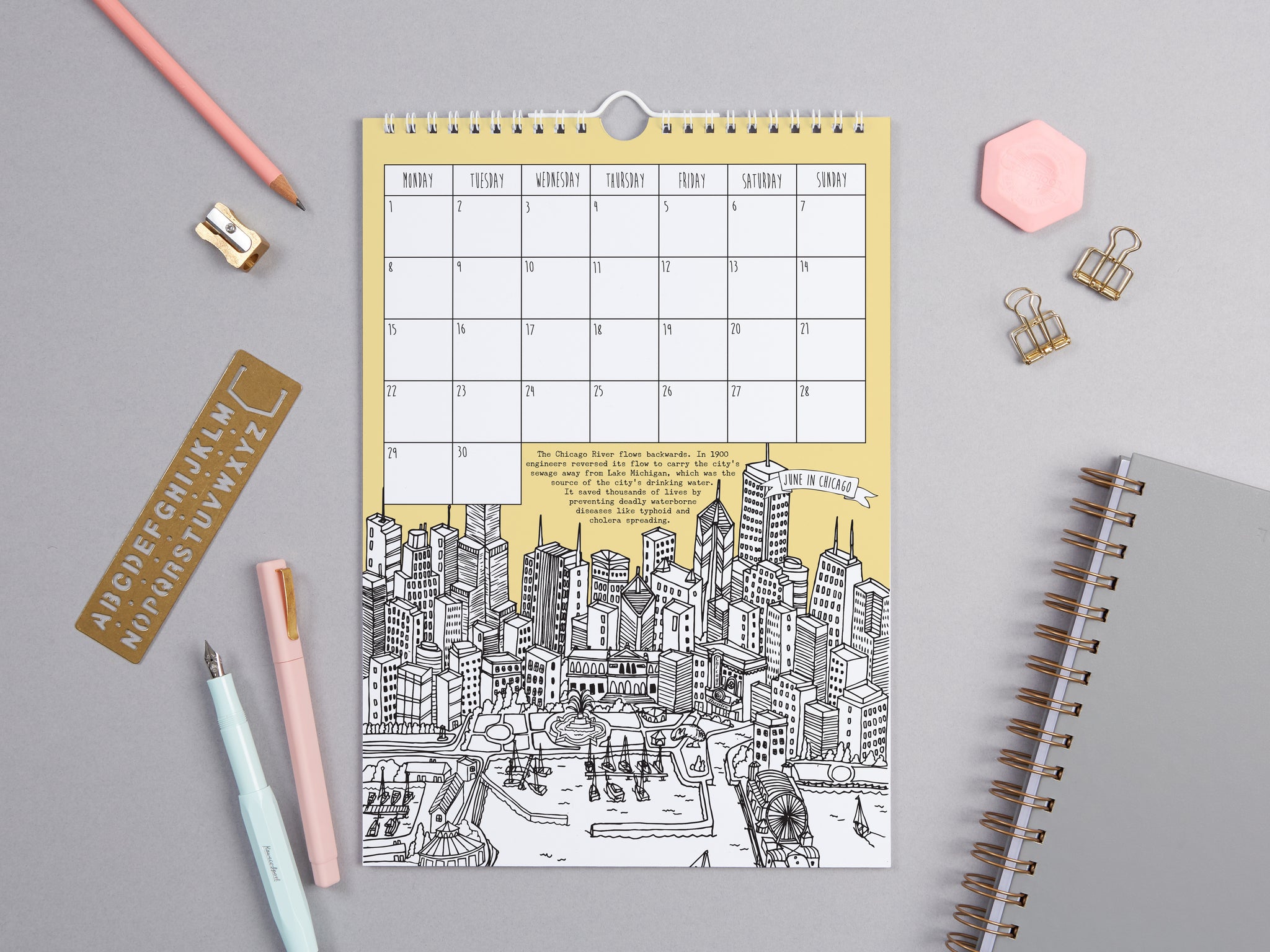 Spend January in Amsterdam, February in Barcelona, March in Brighton, April in Cape Town, May in Cambridge, June in Chicago, July in Edinburgh, August in Hong Kong, September in Luzern, October in Madrid, November in Reykjavik & December in Palma. Treat yourself to this colourful calendar to brighten up any room or give as a gift to globe-trotting travel-loving friends.